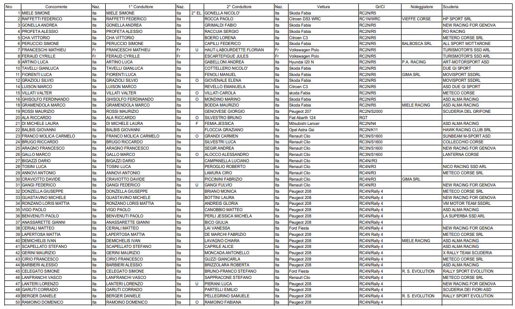 La gara ligure strizza l’occhio a 98 equipaggi pronti a darsi battaglia sulla prova speciale “Passo del Ginestro” da 11,25 chilomteri da ripresi quattro volte per un totale di 45 chilometri. Il tratto cronometrato, facente parte anche del Rally di Sanremo, vedrĂ  scendere in strada con il numero 1 sulle portiere Simone Miele e Nicolò Gonella a bordo di una Skoda Fabia R5 EVO e con tutti i pronostici a loro favore. Il campione della scorsa IrCup dovrĂ  però fare i conti con il giovane siciliano Alessio Profeta, anch’esso sulla Fabia, e con i velocissimi transalpini Mathieu Franceschi e il vincitore del Trofeo Terra France Cyrile Feraud, entrambi su Volkswagen Polo Gti R5. Da segnalare anche la presenza del toscano Luca Artino, al debutto sulla Hyundai i20 N Rally2, e della Citroen DS3 WRC di Federico Raffetti.