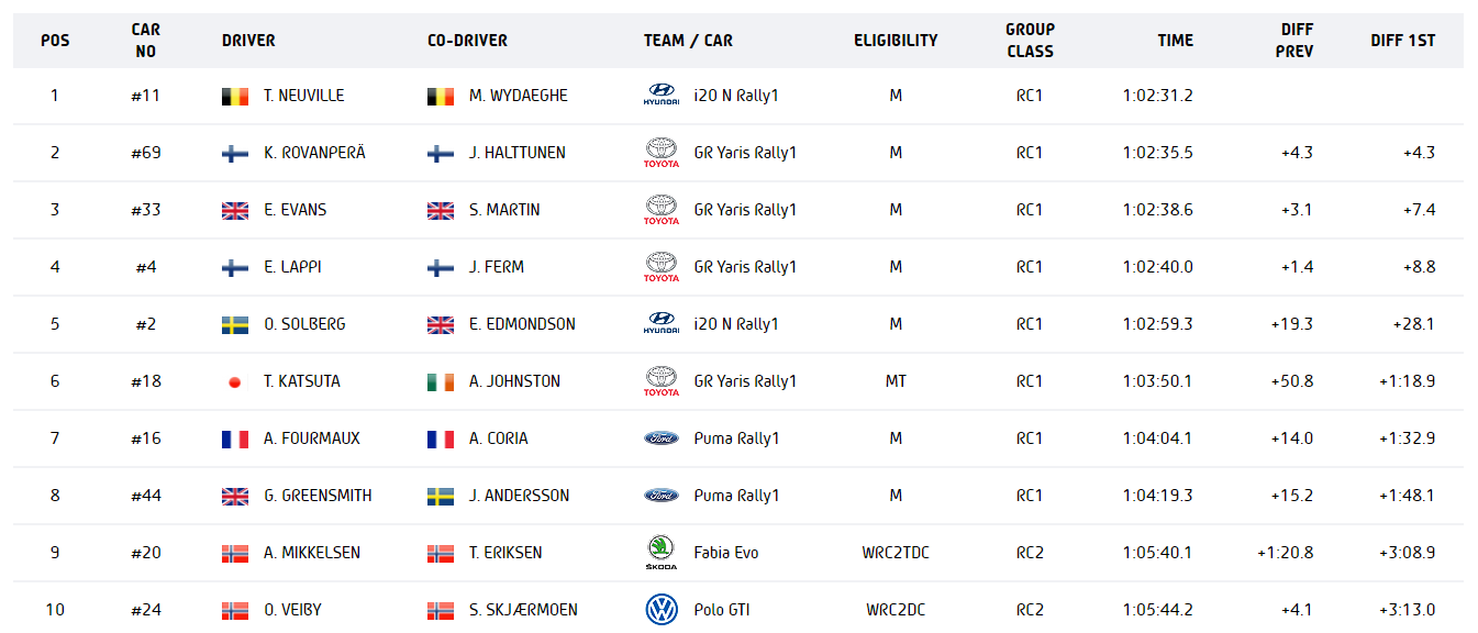 Decima posizione per il norvegese Ole Veiby, che dopo un errore sull’ultima prova della serata si ritrova a perdere la nona posizione assoluta e la leadership di WRC2 con appena 4.1 secondi di ritardo dal connazionale e 3:13.0 dalla vetta assoluta.