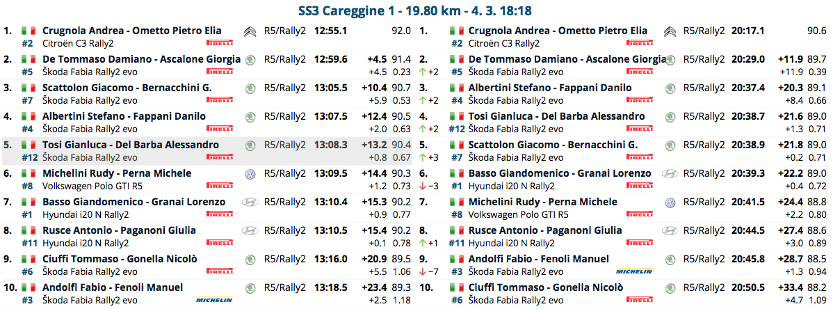 Sul primo passaggio a Careggine, 19.8 chilometri di prova speciale, Crugnola ha allungato ancora, con il solo De Tommaso che è stato capace di restare in scia al pilota Citroen, chiudendo con 4.6 secondi di distacco. Prova lunga, difficile, e molto scivolosa, con molti equipaggi che nel tratto finale in discesa sono andati in leggera difficoltà.