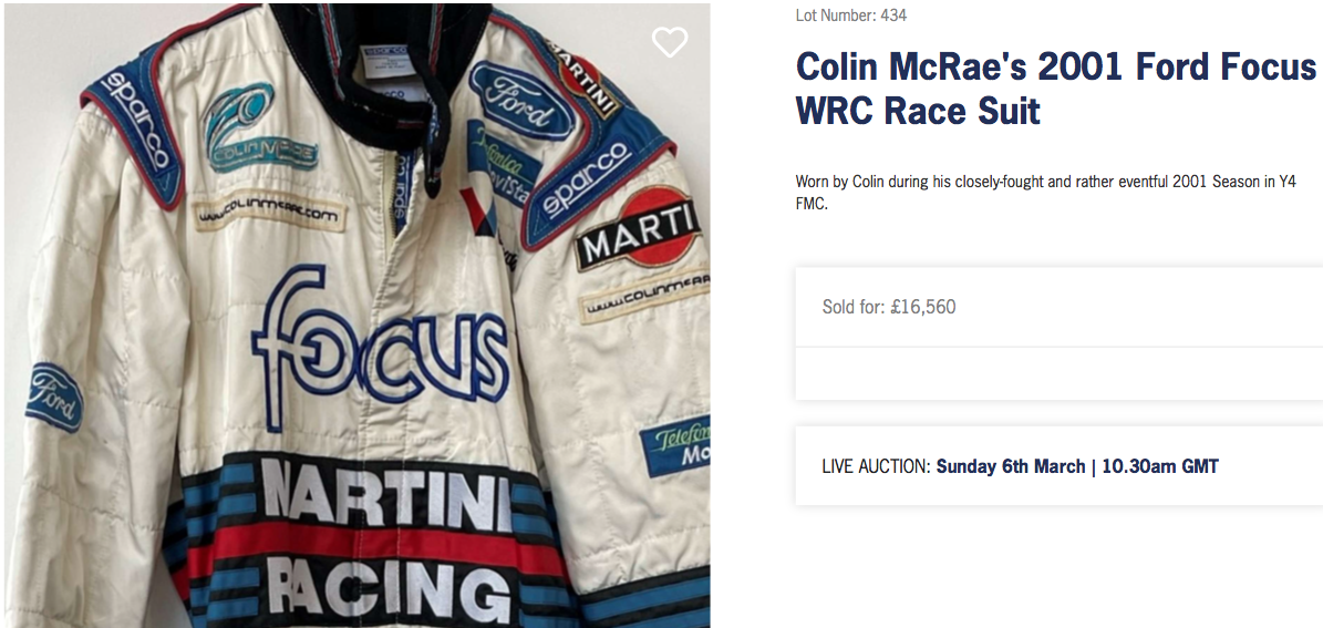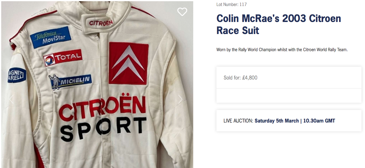 E fra tutti, anche in questo caso, l’oggetto che ha raggiunto il prezzo più alto è legato a Colin McRae. Anzi, precisiamo, i primi due oggetti. Parliamo infatti di due tute da gara appartenute al campione del mondo 1995: una “Ford Martini”, e l’altra “griffata” Citroen.