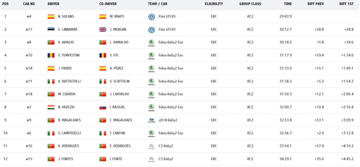 Prova condizionata dalla nebbia e dalle grandi pozze d’acqua in mezzo alla strada. Solans decide di non prendere rischi ma è comunque secondo ad una manciata di decimi da Linnamae, sempre in crescendo in questi ultimi mesi. Anche Araujo cerca di contenere i danni, finendo la prova con 10 secondi di ritardo dall’estone. Dietro di loro l’abisso, con Battistolli quarto che paga 31 secondi in meno di 11 km. Tempestini è settimo a 33,7 e Campedelli undicesimo a oltre 41 secondi (nella generale il romagnolo ha già accumulato in due prove 1 minuto e 48 secondi, inutile ormai prendere rischi). Prova caratterizzata anche dai molti ritiri illustri, a partire da Erik Cais per doppia foratura e Ken Torn, rottura del radiatore. Nei guai per lo stesso motivo anche Efrén Llarena, che già ieri aveva accusato problemi tecnici. Sicuramente non è la sua gara.