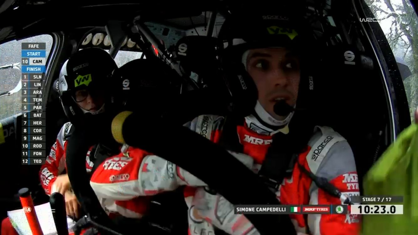 Sulla SS7 Cabeceiras de Basto 2 la Skoda Fabia R5 Evo biancorossa MRF Tyre si è fermata a 50 metri dallo stop della prova. Il motivo è la rottura di un braccio dello sterzo che ha costretto il pilota romagnolo a fermarsi.
