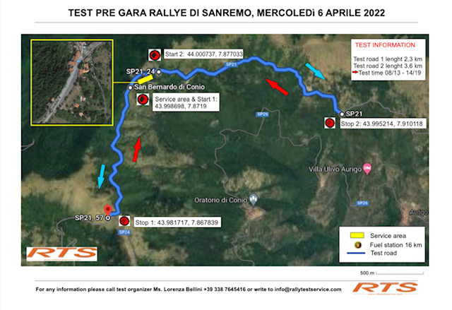 In previsione del 69° Rallye Sanremo, è stata organizzata dalla Rally Test Service una giornata di prove mercoledì 6 Aprile 2022, data ideale per permettere ai team e ai concorrenti di ottimizzare i costi di trasferta ed effettuare i test il giorno prima dell’inizio degli impegni per la gara. La location sarà la famosa e storica inversione di San Bernardo di Conio, mentre il parco assistenza verrà allestito nel piazzale limitrofo. Ai concorrenti iscritti verrà garantita la chiusura di due diverse mini prove speciali, “Colle d’Oggia” e “Casoni”, entrambe utilizzabili alternativamente tutto il giorno dalle ore 8:00 alle ore 13:00 e dalle ore 14:00 alle ore 19:00.