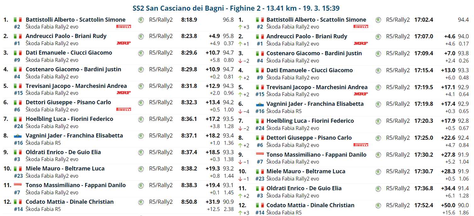 Alla fine della seconda ripetizione della P.S. “San Casciano dei Bagni – Fighine” ad avere la meglio su tutti è Alberto Battistolli, coadiuvato da Simone Scattolin, che, con una prova di forza sulla seconda ripetizione, riesce a superare Paolo Andreucci, in seconda posizione provvisoria, e Giacomo Costenaro, vincitore della prima prova speciale ed in momentanea terza posizione.