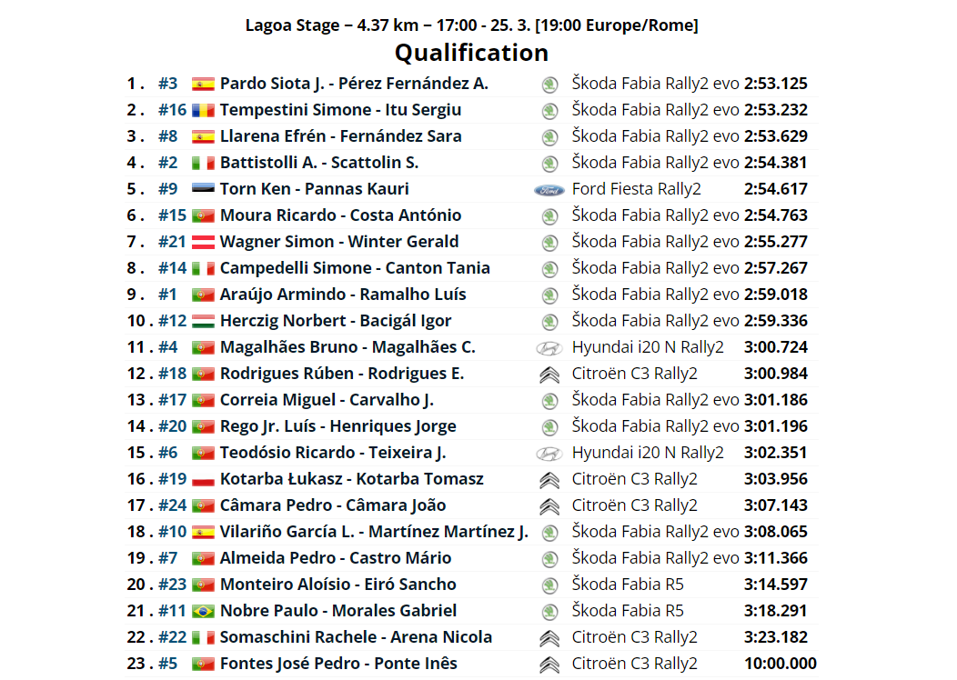 Terminata da qualche ora la prova di qualificazione del Rally delle Azzorre, seconda tappa dell’ERC 2022. Sulla Lagoa Stage da 4.37 km il più veloce è stato il pilota spagnolo su Skoda Fabia Rally2, che ha battuto per un soffio Simone Tempestini.