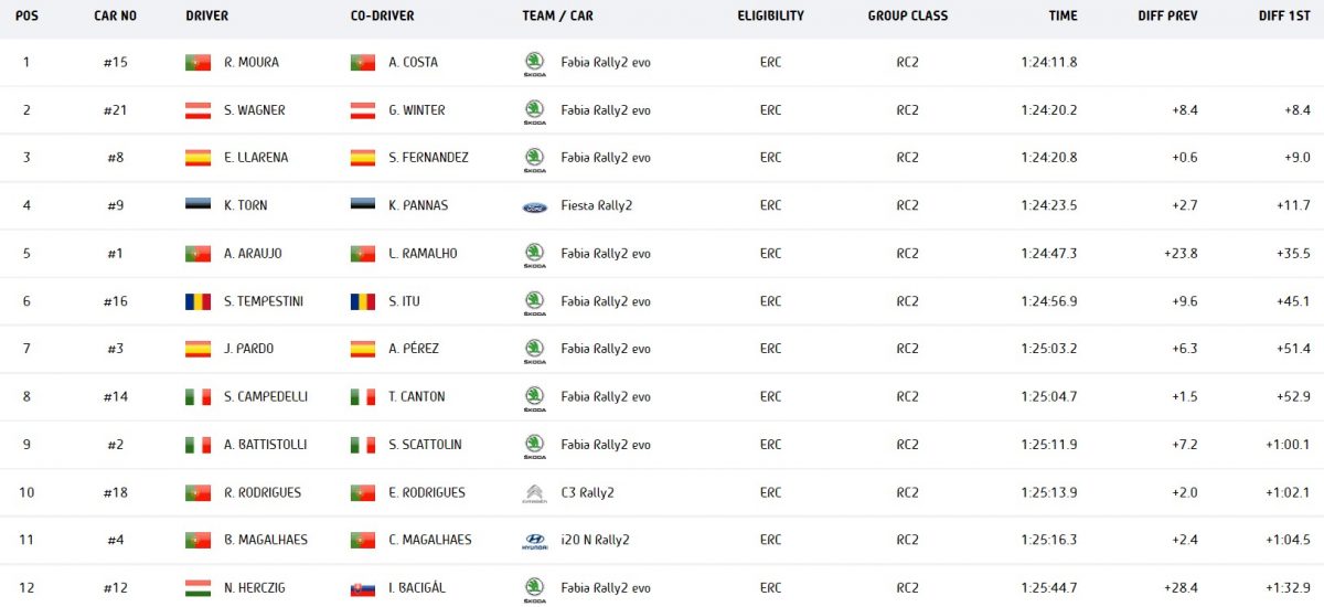 Seconda piazza per Rego Jr dinanzi alla Fiesta Rally2 di Ken Torn con paritempo di Ricardo Moura. Il portoghese incrementa di una manciata di secondi il vantaggio su Wagner e si conferma al comando in attesa della lotta finale di domani. Non smuove la classifica Campedelli, ottavo.