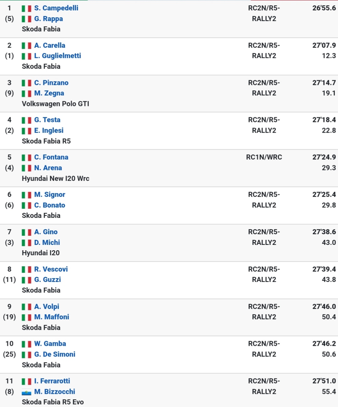 Malgrado il cielo abbia trovato un po’ di serenità, l’asfalto rimane umido e insidioso. Campedelli sigla il miglior tempo con la Fabia Evo Rally2 gommata MRF e infligge un distacco di 4 decimi al molisano Giuseppe Testa. Il terzo tempo é del vicecampione Andrea Carella, anche lui su Skoda, con un leggero ritardo di 1.6’’. Stesso tempo impiegato da Corrado Pinzano su Volkswagen Polo Gti R5.