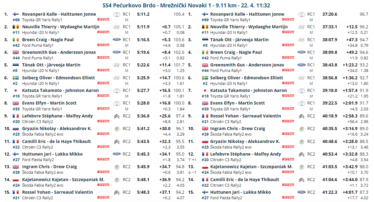 A fare la voce grossa è Kalle Rovanpera che vince tre delle quattro prove disputate, lasciando un solo scratch al compagno di squadra Elfyn Evans che si è complicato la vita con la foratura occorsa nella prima prova speciale di giornata Mali Lipovec – Grdanjci 1 da 19.20 km. Il finlandese di Toyota sta cercando di fare il vuoto alle sue spalle ed ha per il momento smentito coloro che lo vedevano tra quelli in difficoltà su asfalto.
