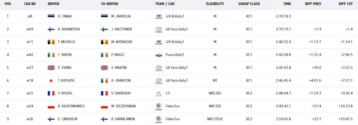 Terzi Thierry Neuville e Martijn Wydaeghe, che proprio sulla power stage escono violentemente di strada forando 2 ruote e rompendo l’interfono. Stavolta però, dopo mille sfortune, il belga è fortunato e riesce a concludere e, grazie al grande vantaggio su Breen, ha mantenere il podio. La classifica della power stage vede assegnati i punti in questo ordine: Rovanpera, Tanak, Evans, Breen e Lindholm.