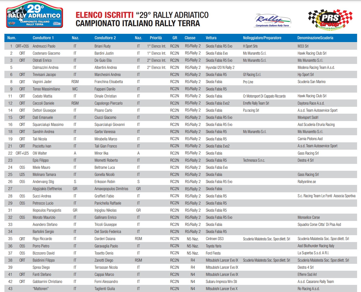 Di seguito mostriamo l’elenco iscritti del 29° Rally Adriatico: