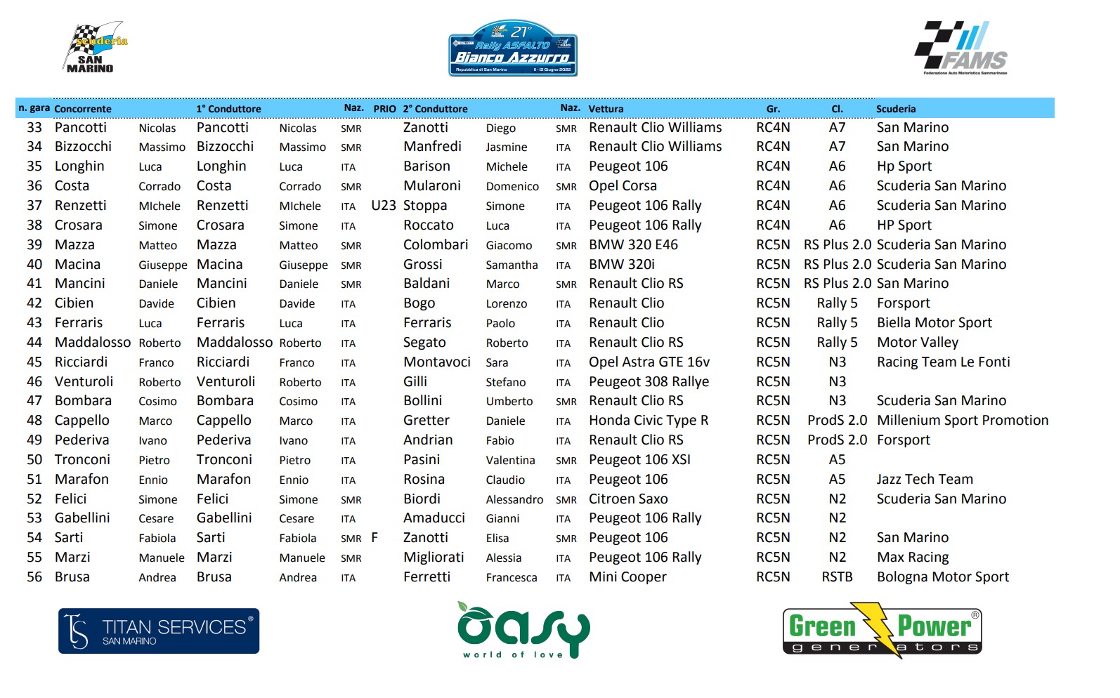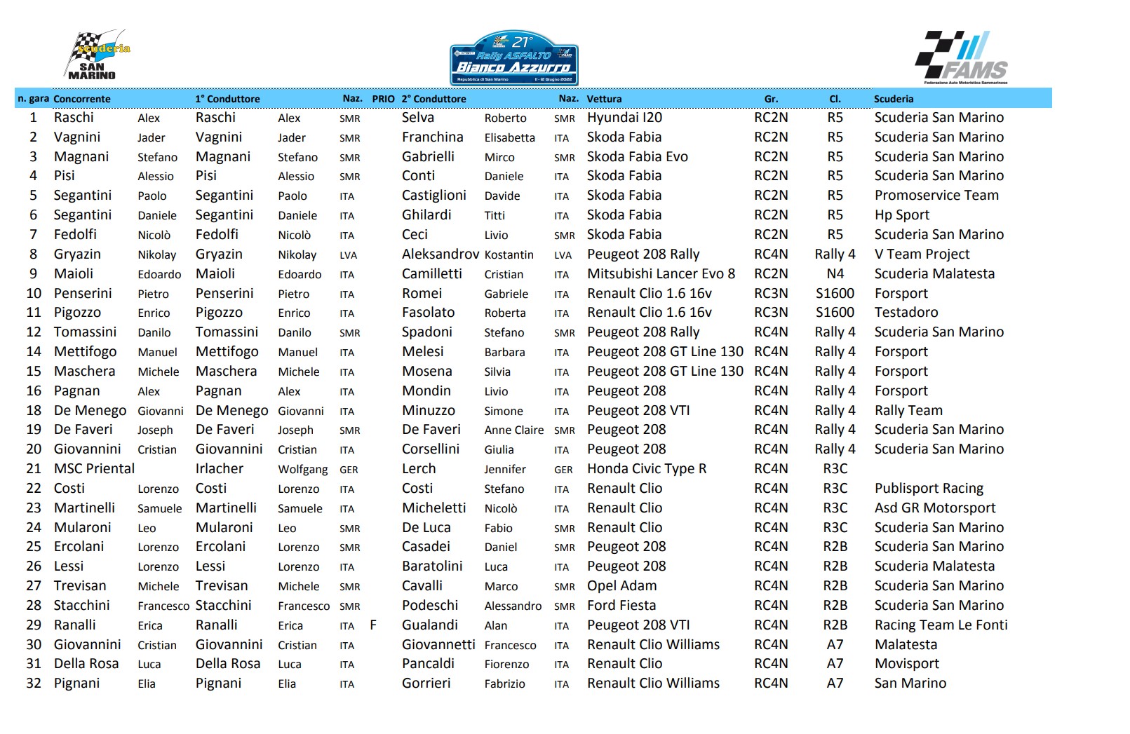 Di seguito indichiamo l’elenco iscritti della 21° edizione del Rally Bianco Azzurro: