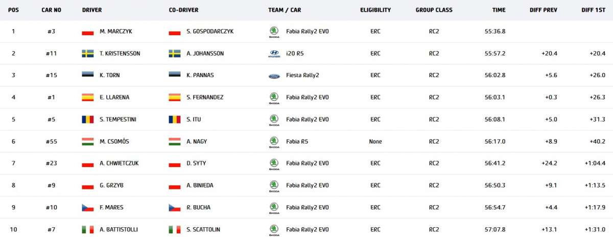La giornata è vissuta tutta sul duello tra Miko Marczyk e Nil Solans, con lo spagnolo (iscrittosi alla gara all’ultimo minuto) che era in testa con 5 secondi di vantaggio alla fine della ps Wojnasy 2. Proprio la ripetizione delle prove ha reso quest’ultime veramente complicate perché il terreno, come si diceva sabbioso e bagnato, non ha retto bene al primo passaggio delle vetture, facendo trovare sul secondo passaggio rotaie profondissime ed un sacco di grandi pietre scoperte.