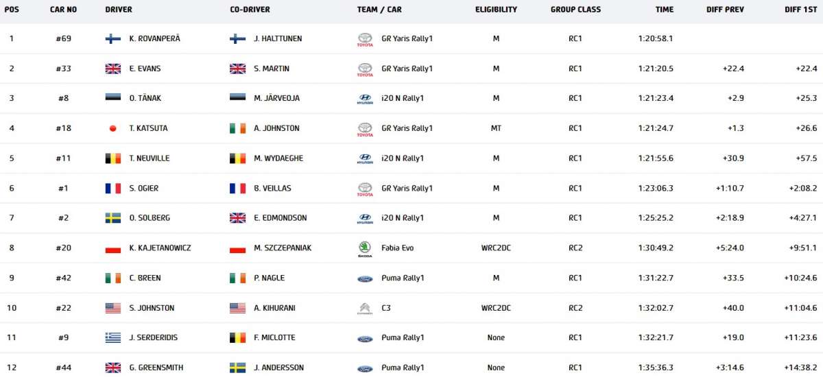 Evans, col sesto posto perde la terza piazza generale provvisoria e le Puma e la Hyundai di Breen e Greensmith Solberg e Serderidis chiudono la classifica delle RC1. Kajto viaggia in solitaria nel Wrc2.