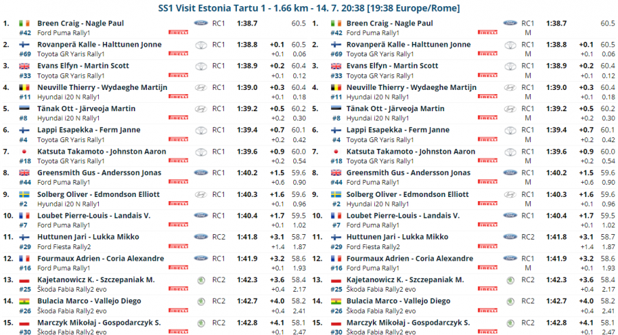 Prima speciale del rally di Estonia e Craig Breen mette subito in chiaro che è qui per migliorare i due secondi posti ottenuti negli anni passati. L’irlandese intende migliorarsi anche dal sesto posto del Kenya e soprattutto vorrebbe ottenere un altro podio. Nonostante una guida attenta per le rocce a lato strada, Breen, fa registrare il miglior tempo in 1’38.7”. Alle sue spalle il vincitore dell’anno scorso anno, nonché leader del mondiale, Kalle Rovanperä. Il giovane finlandese ritorna sulle strade che l’hanno visto grande protagonista l’anno scorso. La prima vittoria del mondiale, infatti, l’ha ottenuta proprio sul veloce sterrato estone, simile alle sue strade di casa in Finlandia.