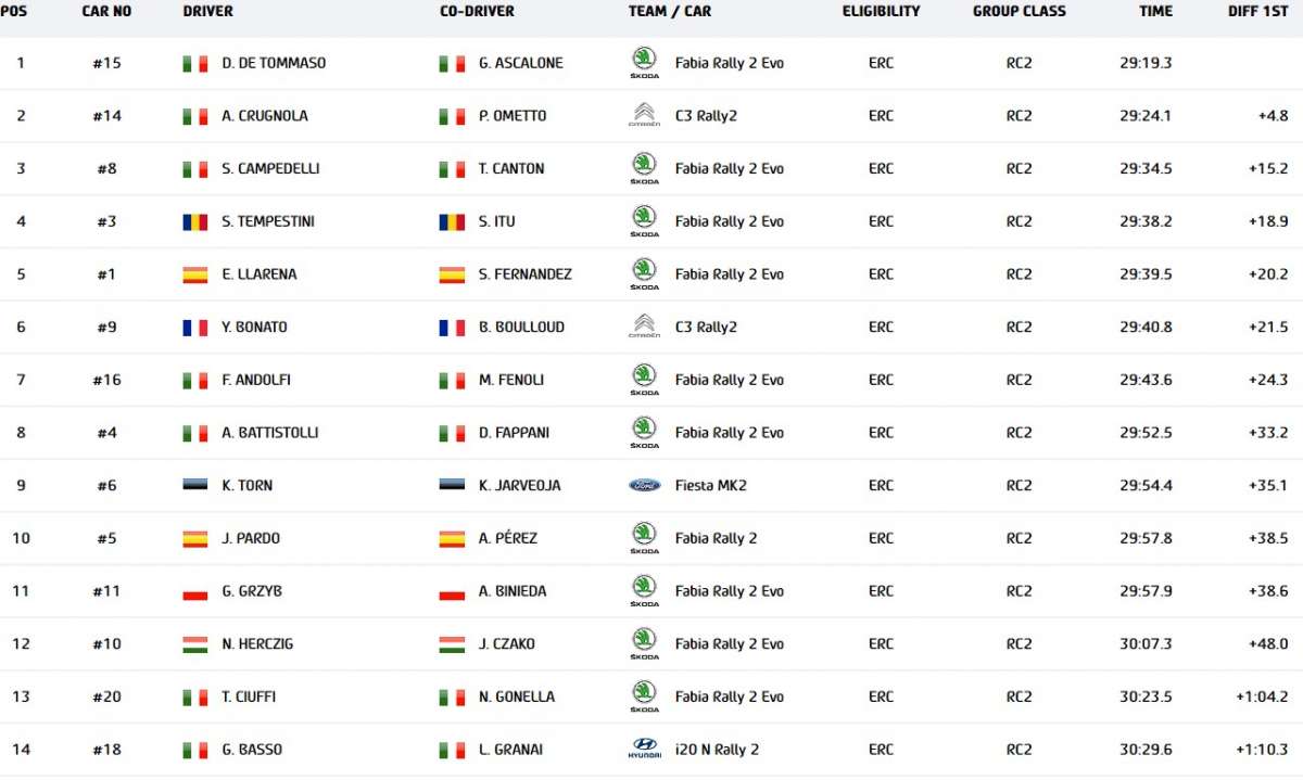 Partono forte Giandomenico Basso e Lorenzo Granai, ma forse partono anche troppo forte, tanto che prendono una penalità per partenza anticipata. I campioni italiani in carica vincono la prova ma, trattandosi del secondo jump start dopo la super speciale di ieri, prendono una penalità di 1 minuto, un macigno enorme in una gara veloce come questa. Ne approfitta De Tommaso che allunga di qualche decimo su Crugnola. Interessante il terzo tempo assoluto di Guigou con l’Alpine (che però si ritirerà nella prova successiva per incidente). Alberto Battistolli, stavolta in coppia con Danilo Fappani, si gira ma per fortuna senza conseguenze.