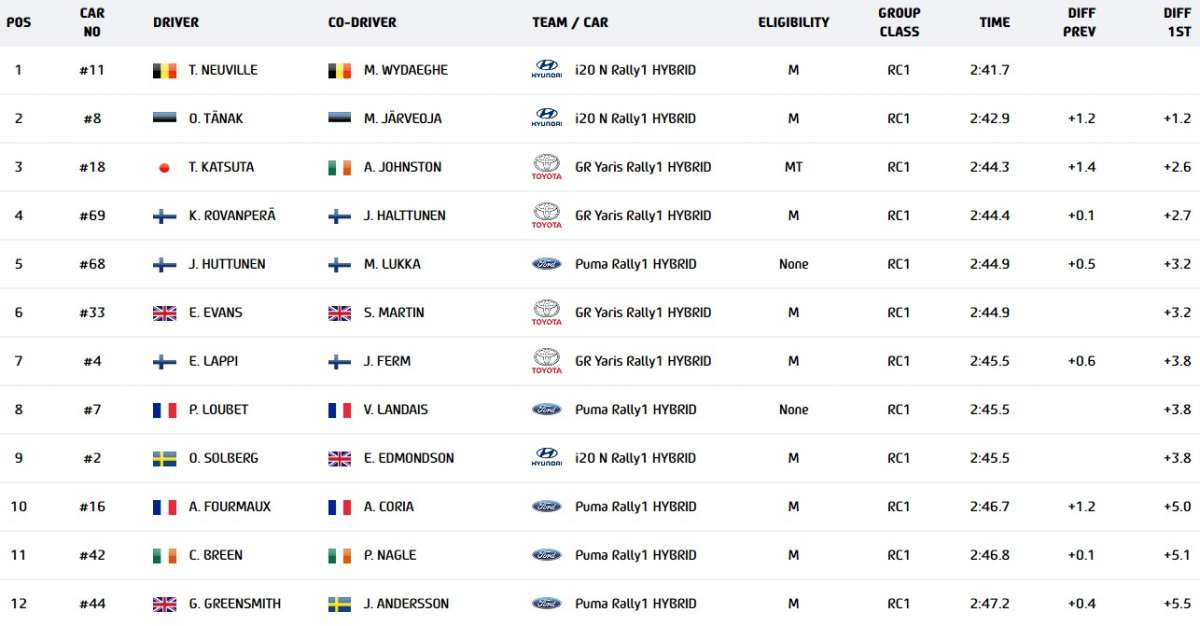 La vera sorpresa è Jari Huttunen. Anche lui pilota di casa, al debutto con la Ford Puma Rally1. Quinto assoluto e il migliore fra i piloti di M-Sport. Il giovane finlandese fa registrare lo stesso tempo del vincitore dell’anno scorso Elfyn Evans. Staccati di sei decimi troviamo un terzetto formatto da Lappi, Loubet e Solberg. A chiudere la top 10 Adrien Fourmaux.