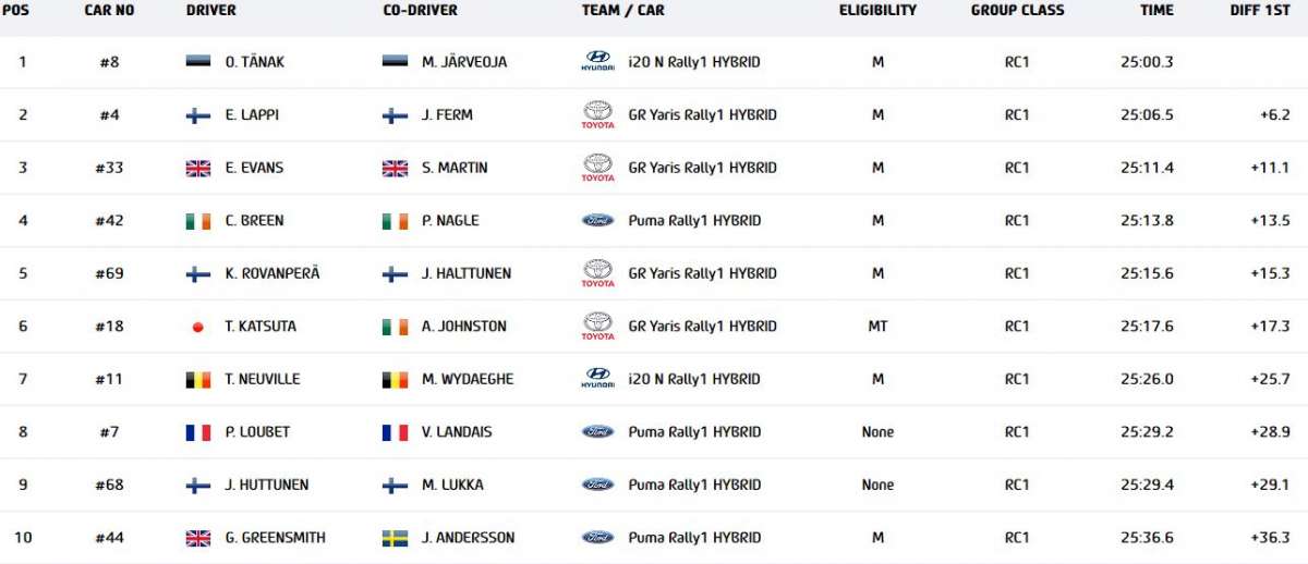 È Ott Tanak a vincere la sua seconda prova della giornata. L’estone spreme ogni goccia di potenza dalla sua i20 N Rally 1 e sfrutta ogni millimetro della carregiata per riuscire a mettersi dietro tutti gli altri. La sua dichiarazione a fine prova vale più di ogni ulteriore commento:
