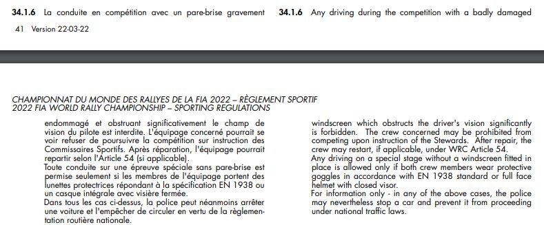 E’ vietato guidare con un parabrezza seriamente danneggiato che oscuri in maniera significativa la visibilitĂ del pilota. All’equipaggio interessato potrebbe essere impedito di continuare la gara a discrezione degli Stewards. Dopo le riparazioni l’equipaggio può riprendere la gara, se previsto, secondo quanto previsto dall’articolo 54. Guidare in prova speciale senza il parabrezza è consentito solamente nel caso in cui entrambi i piloti indossino maschere protettive in accordo con lo standard EN1938 o un casco integrale con visiera chiusa. Per informazione, in tutti i casi descritti sopra, la polizia potrĂ comunque fermare l’equipaggio e impedirgli di proseguire su strade pubbliche regolamentate dalle normali leggi.