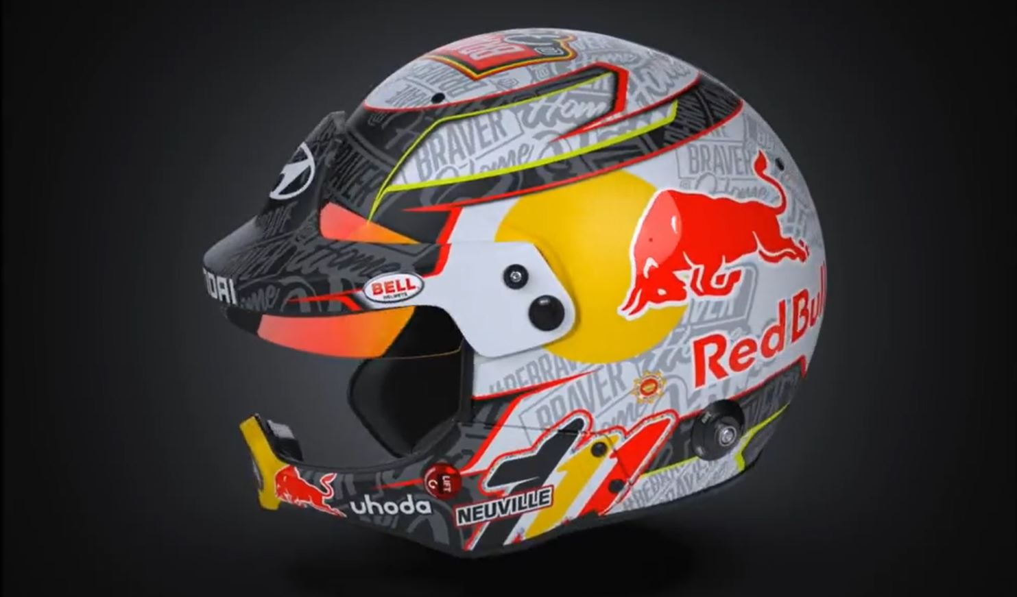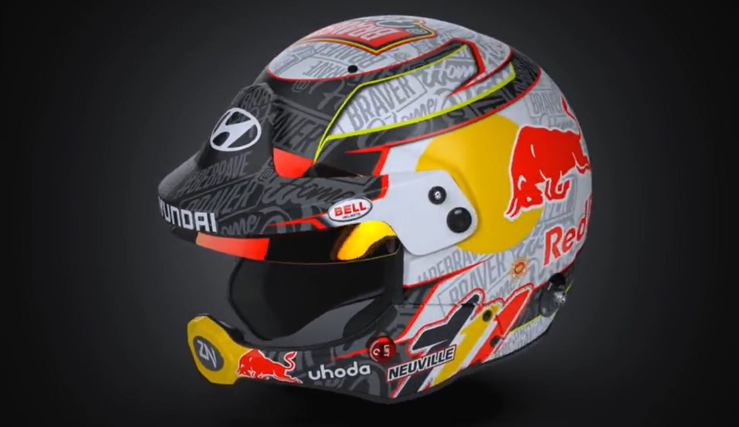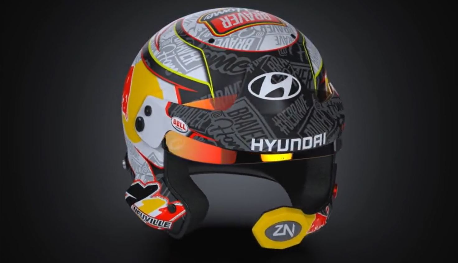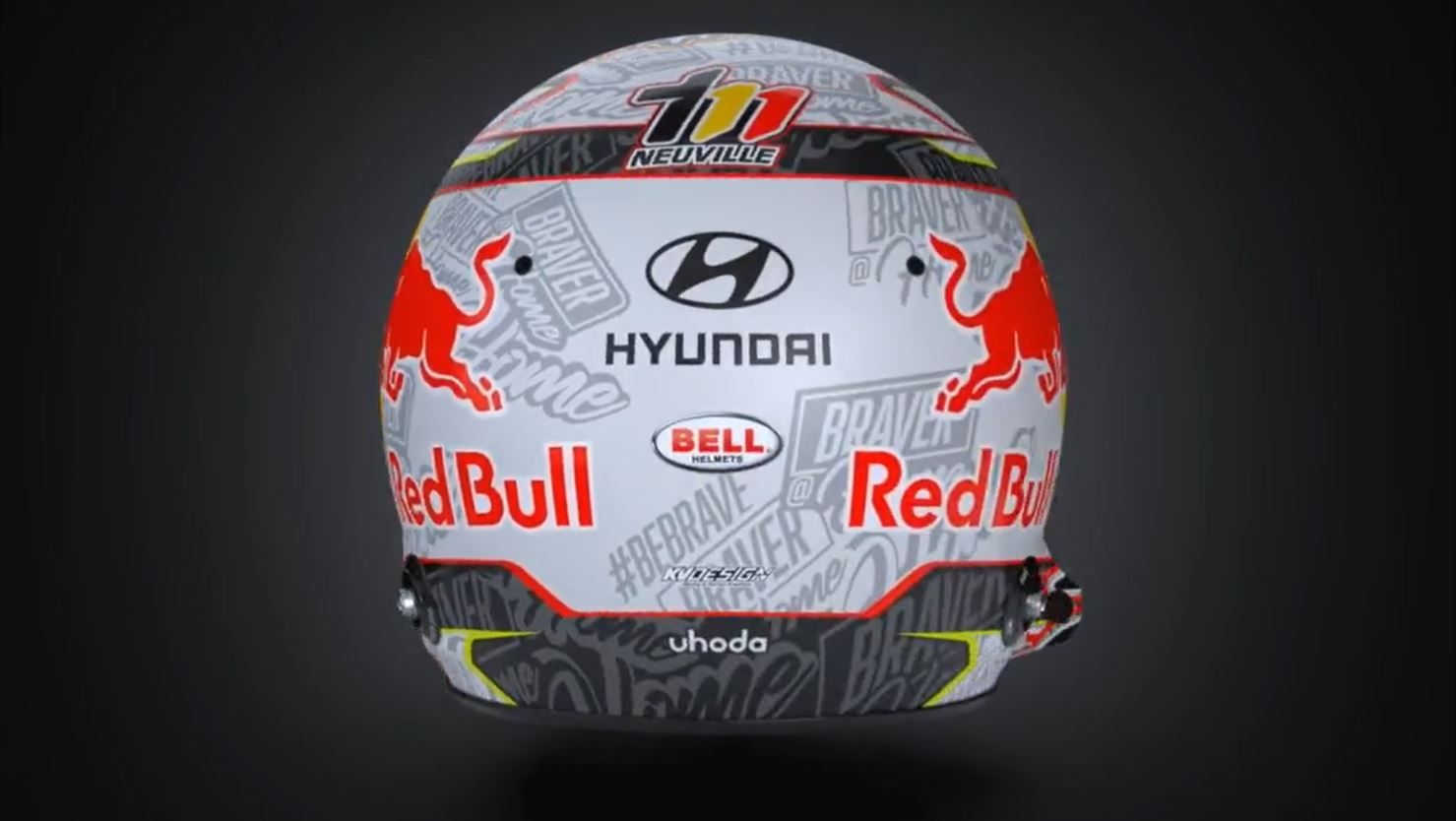 Braver@home, compare su magliette, cappellini, e ovviamente sul nuovo casco che Neuville ha fatto preparare per l’occasione. Al posto delle varie tonalità di blu, di solito predominante, sono comparsi il grigio e il nero, con la scritta brave@home come pattern ripetuto su tutta la superficie. Immancabile ovviamente lo sponsor Red Bull e il logo Hyundai sul frontale.