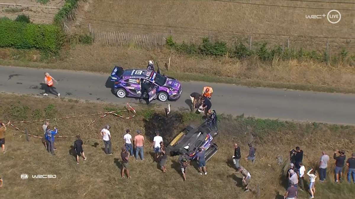 Il risultato è simile a quanto abbiamo visto ieri su Rovanpera, con la macchina che si è impuntata e ribaltata, fermandosi sul tetto. A complicare ancora di piĂą la situazione anche un principio d’incendio dell’erba secca intorno alla macchina, fortunatamente subito spento.