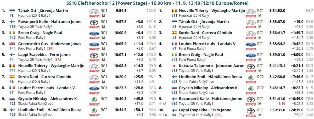 Dopo le tre Hyundai troviamo quindi la prima Puma Rally 1, quella del sorprendente Pierre-Louis Loubet che, gara dopo gara, sta dimostrando di meritare quel sedile, forse di piĂą del suo connazionale Fourmaux. Quinto Craig Brain con Paul Nagle (che ha festeggiato il suo centesimo rally in WRC). Finalmente Craig vede l’arrivo e porta a casa un po’ di punti, anche se rimane grande il rimpianto per la foratura di venerdì.