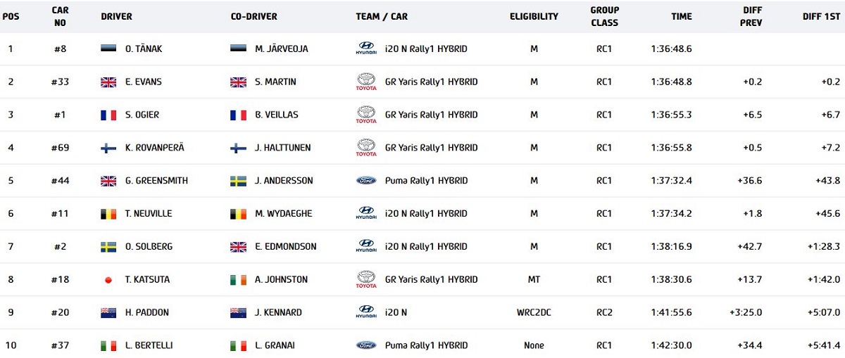 Alle sue spalle, staccato di soli 0,2 secondi un redivivo Elfyn Evans che ha condotto una giornata di grande regolarità, staccando anche un miglior tempo e riuscendo a tenere il passo del duo estone, nonostante qualche disagio con la sua Yaris Rally1.