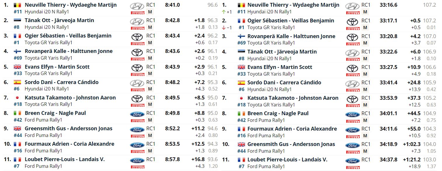 Il più veloce sommando i quattro tratti cronometrati è stato Thierry Neuville, con Sebastien Ogier che si è comunque attaccato al treno del belga, accusando appena 5 decimi di ritardo dal pilota Hyundai. Ogier, partito indietro, si è trovato in parecchi tratti a dover gestire lo sporco in traiettoria, giusto per capire lo spessore della sua prestazione. Il francese si è aggiudicato anche la terza speciale di giornata, dimostrando di essere un serio pretendente al successo finale.