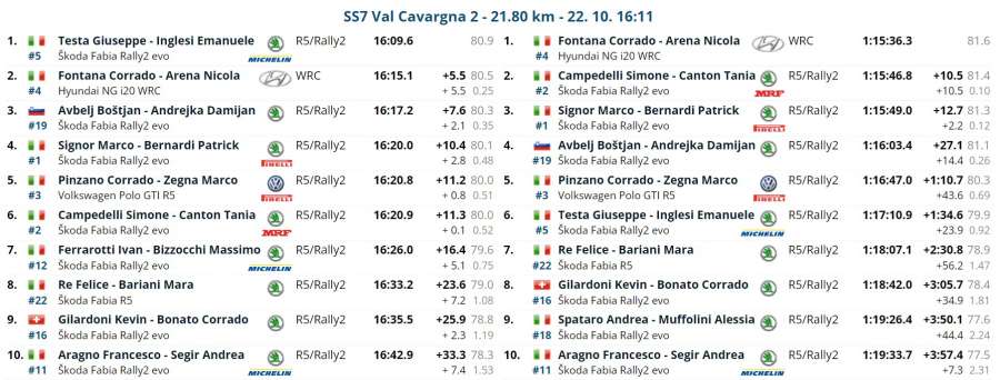 A concludere la top 10 troviamo la ormai numerosa flotta di Skoda Fabia Rally2 con l’equipaggio Testa-Inglesi arrivato con un distacco che supera il minuto e che si ferma su 1:34.6.