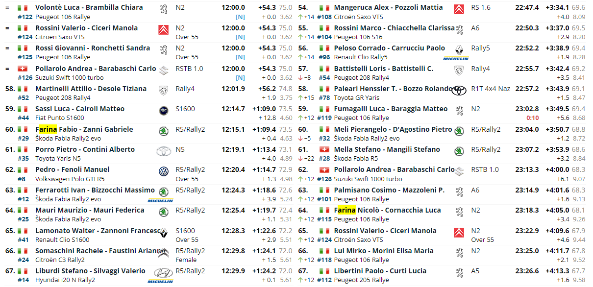 Come possiamo notare dinanzi, ad esempio il tempo di Fabio Farina a bordo della Skoda Fabia R5 è stato di 12:15.1 ben 15 secondi più lento delle vetture che vanno dal numero 73 al 126. Questo caso non è isolato solo a Fabio Farina, ma anche a molti altri piloti a bordo di vetture R5, questo a dimostrazione che non ci sia stato un errore da parte di Fabio.