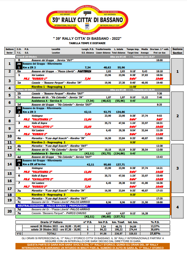 * l’orario si riferisce al 17° Rally Storico Città di Bassano. Il 39° Rally Internazionale Città di Bassano partirà a seguire con un intervallo che sarà deciso dal direttore di gara.