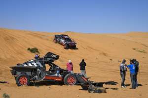 Pochi metri più avanti anche il compagno di squadra Carlos Sainz è costretto a fermarsi per problemi tecnici. Emblematica l’immagine delle due Audi ripresa dall’elicottero ferme a poca distanza l’una dall’altra (link). Altro pilota, fra i top drivers, a incorrere in problemi è stato il terzo in classifica, Yazeed Al-Rajhi. L’arabo si ferma per problemi alla posteriore destra al 215esimo chilometro. Nell’arco di soli tre chilometri, quindi, escono tre dei possibili contendenti alla vittoria.