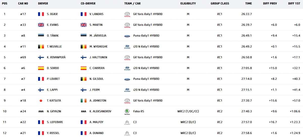 Più tardi finirà nella medesima trappola anche Serderidis perdendo parecchio di più. Dalla prova esce primo Ogier, sempre davanti a Evans, ma questa volte con un margine di 4,7 secondi, arrotondando così il vantaggio di fine giornata a 6 secondi netti. Terzi in prova ed anche nella generale Ott Tanak e Martin Jarveoja, che con un perfetto damage control limitano al massimo i danni, sebbene il distacco a fine giornata sia già di 15,4 secondi. Insieme a Tanak, nello spazio di 1,7 secondi, ci sono anche Neuville e Rovanpera. Tutto fa pensare che domani ne vedremo delle belle!