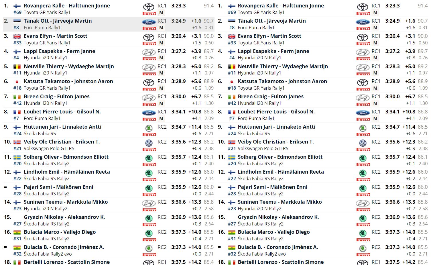 Sui 5,16 chilometri in notturna della Umea Sprint il porta colori Toyota, primo a transitare, ha staccato Ott Tanak di 1.6 secondi. Kalle non era apparso così soddisfatto ai microfoni di WRC Plus, denunciando il fatto di essere stato forse troppo cauto nel tratto veloce in mezzo alla foresta. Non sembra essere stato così invece, o forse la superiorità del finnico è talmente schiacciante da potersi permettere qualche passaggio in tranquillità . Lo scopriremo domani.