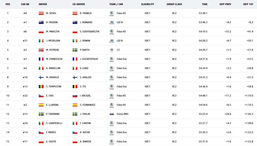 A fare da voce grossa agli inseguitori ci pensa il pilota locale Mikolaj Marczyk che a bordo della nuova Skoda Fabia RS Rally2 riesce ad occupare il gradino più basso del podio arrivando con un ritardo di 41.4 secondi.