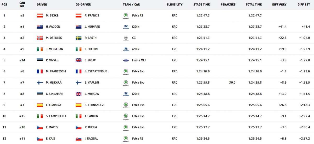 Dalla terza prova (la seconda è stata cancellata per motivi di sicurezza) è iniziato a piovere e la vantaggiosa posizione di partenza scelta da Sesks non ha dato piĂą i benefici sperati dall’eroe locale ma, nonostante tutto, prova dopo prova, l’equipaggio lettone ha continuato ad aumentare il suo margine fino a chiudere la gara con 41,4 secondi su Hayden Paddon e John Kennard. Il Kiwi ha pensato piĂą alla classifica del campionato che ad inseguire Sesks, rispetto al quale ha contestato solo la power stage, finita esattamente con lo stesso tempo!