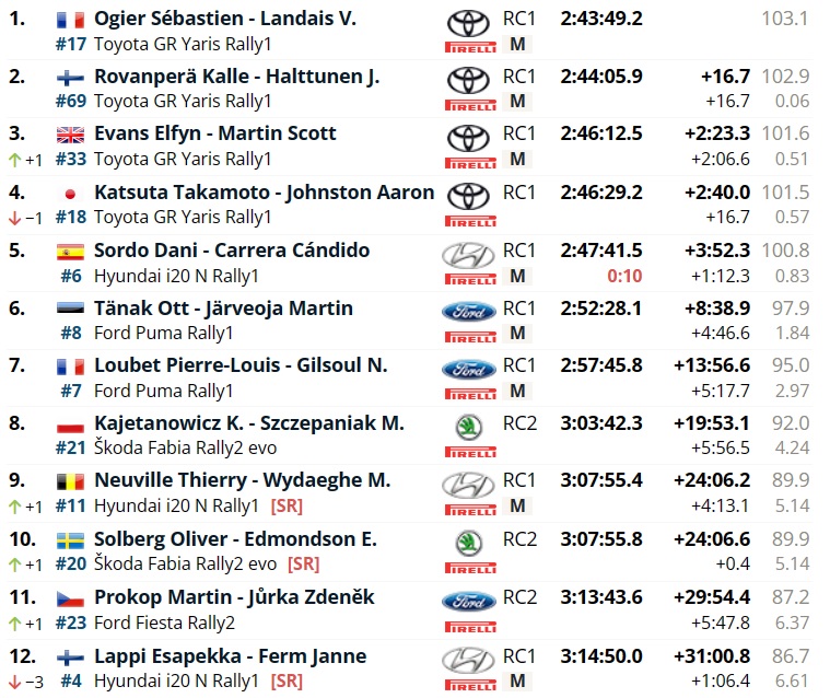 Bello scratch del giapponesino Katsuta che vince la speciale davanti ad Ogier e ad una rediviva Hyundai, quella di Thierry Neuville. Grazie all’ottimo tempo del nipponico, scavalca il compagno di squadra Elfyn Evans e conquista la terza piazza della classifica generale.