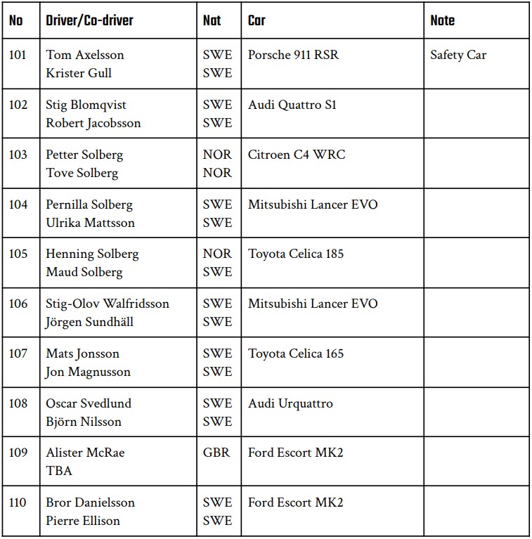 E invece, gli svedesi si sono reinventati una gara estiva e non solo sono riusciti a piazzarla nell’ERC (per altro un gran bel campionato quest’anno) ma hanno inserito una categoria di “Rally Legends” i cui nominativi non hanno bisogno di alcuna presentazione, per cui ve li riportiamo semplicemente qui sotto: