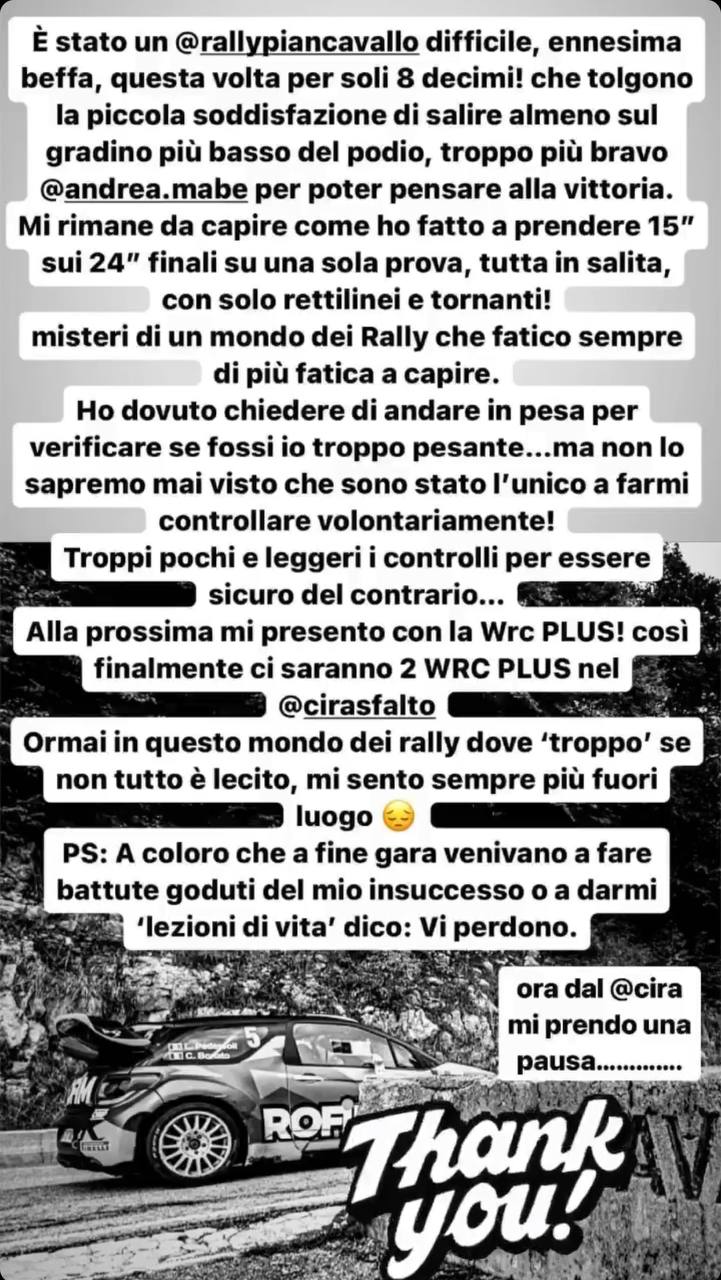 Al momento nessuna delle parti chiamate in causa (in particolar modo quelle taggate direttamente sul post) ha replicato ma, a questo punto, la gara è tutt’altro che conclusa. Mentre l’avventura nel CIRA per il pilota Citroen pare si fermi qui, almeno per il momento.