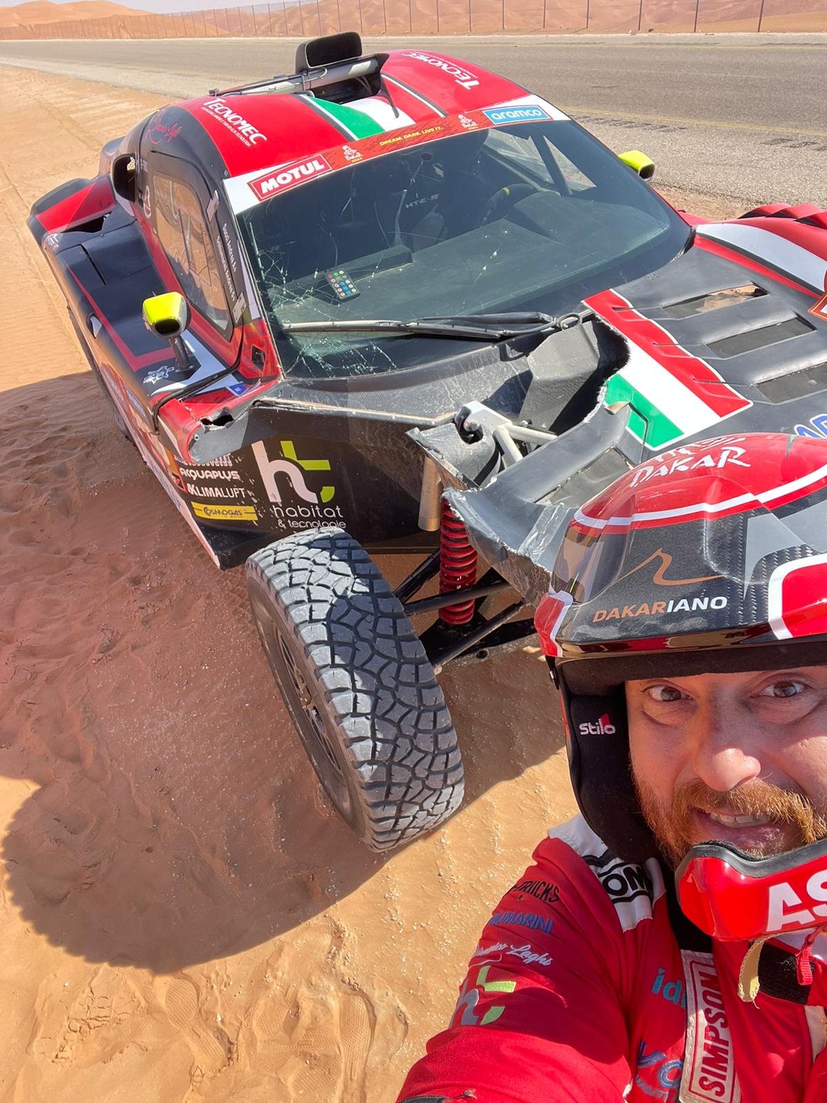 ” La CRONO 48H si è rivelata una tappa durissima. Non avevo mai affrontato una tappa così. Una distesa infinita di dune L1/L2/L3. Abbiamo usato tutte le nostre forze e la nostra esperienza per arrivare al traguardo. Mentre cercavamo di uscire da un buco infernale siamo decollati e l’impatto violento con una duna ha sensibilmente modificato l’anteriore del Century che ha subito solo danni estetici e non strutturali. Chiudere questa tappa è stato qualcosa di veramente grande, perché non era affatto scontato riuscire ad arrivare alla fine dei 500 km. In compenso abbiamo visto panorami meravigliosi e fatto dei passaggi sulle dune che mai avrei pensato di poter fare.
