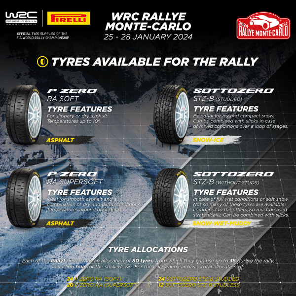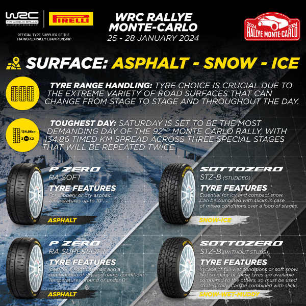Il Rally di Monte-Carlo è, infatti, la gara nella quale la giusta scelta e la corretta gestione dell’ampia gamma di pneumatici a disposizione conta forse più di ogni altra considerazione, a causa dell’estrema varietà dei fondi stradali, che cambiano da una prova all’altra e nel corso della giornata.