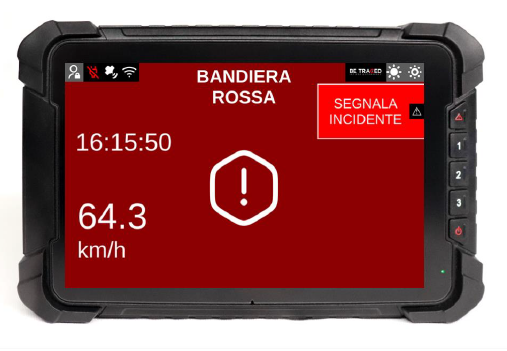 Quando la bandiera rossa viene inserita dal Direttore di Gara il dispositivo che si trova nella zona interessata dalla segnalazione emetterà immediatamente un segnale acustico, accompagnato da una schermata completamente rossa che mostra la scritta “BANDIERA ROSSA”. È necessario premere l’icona “CONFERMA RICEZIONE” per inviare alla Direzione Gara la conferma di aver ricevuto la segnalazione e, se necessario, segnalare l’incidente.