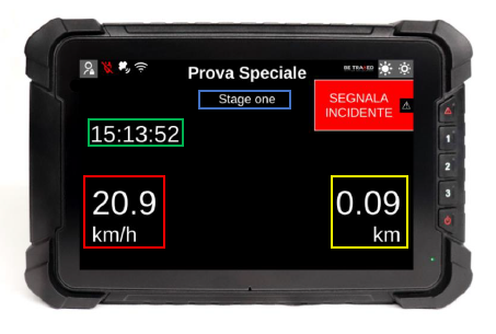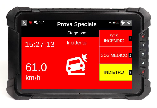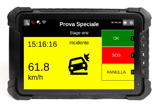In caso di veicolo fermo in prova speciale lo strumento rileva la fermata e dopo 15 secondi invia un segnale d’allarme in Direzione Gara, segnalando l’anomalia. L’equipaggio dovrà, entro 60 secondi dallo stop, indicare il proprio problema (eventuali ritardi nella comunicazione potranno essere sanzionati con una ammenda di 250,00€). Nel caso in cui l’equipaggio non necessiti di soccorso è necessario premere OK e selezionare, in base alla situazione, OK STRADA LIBERA o OK STRADA BLOCCATA: