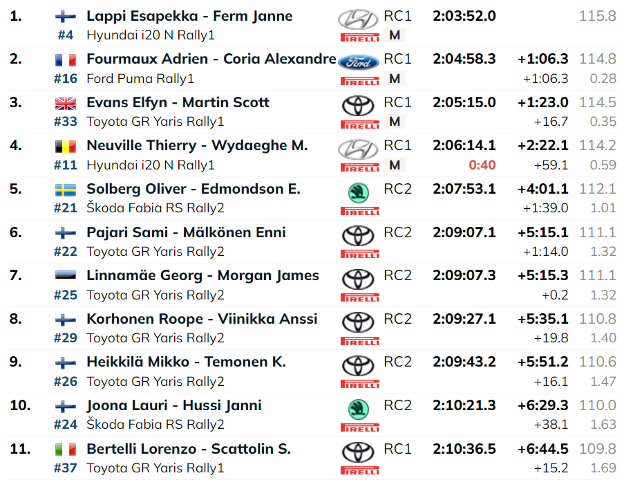 Lappi guadagna, provvisoriamente, 18 punti – Formaux: 15 punti, Evans: 13 punti, Neuville: 10 punti, Solberg: 8 punti, Pajari: 6 punti, Linnamae: 4 punti, Korhonen: 3 punti, Heikkila: 2 punti, Joona: 1 punto.