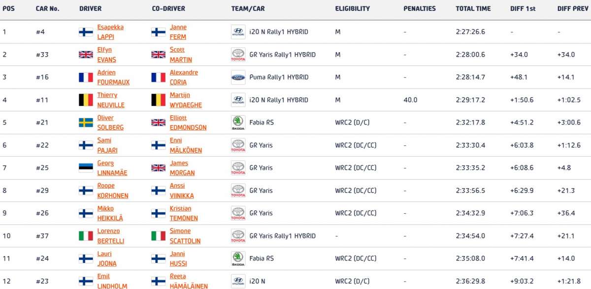 Manca solo la power stage e le leadership in WRC e WRC2 sono ben salde nelle mani di Esapekka Lappi e Oliver Solberg. I due capoclassifica, aiutati da Janne Ferm e Elliot Edmonson, cercano di tenere la pressione e lo stress sotto controllo per cercare di portare a casa una vittoria che, per entrambi vale oro, anche se per diversi motivi.