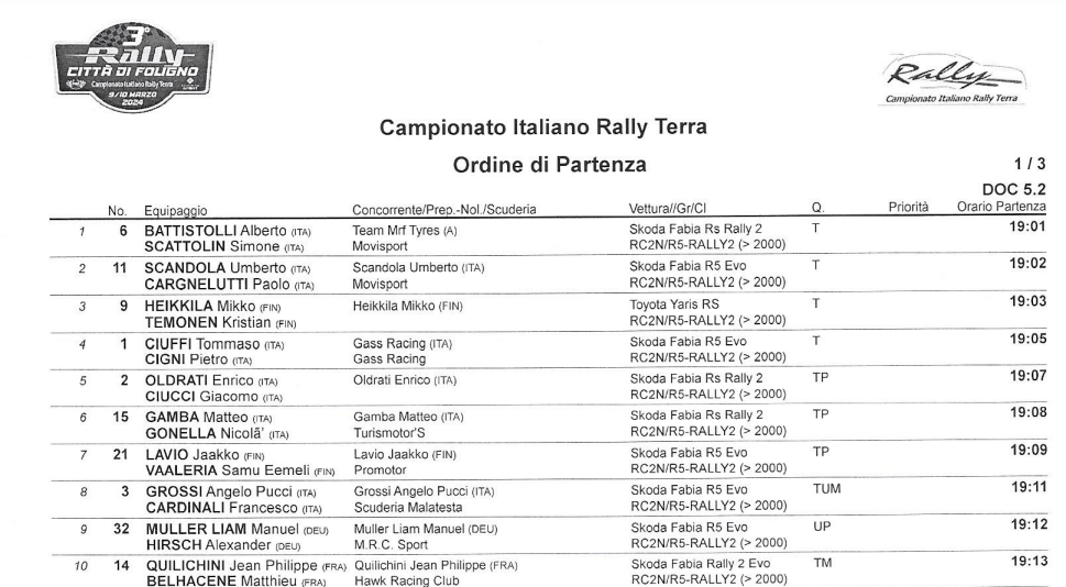 Questo l’ordine di partenza dei primi 10 equipaggi durante il primo giro di prove del 3° Rally Città di Foligno:
