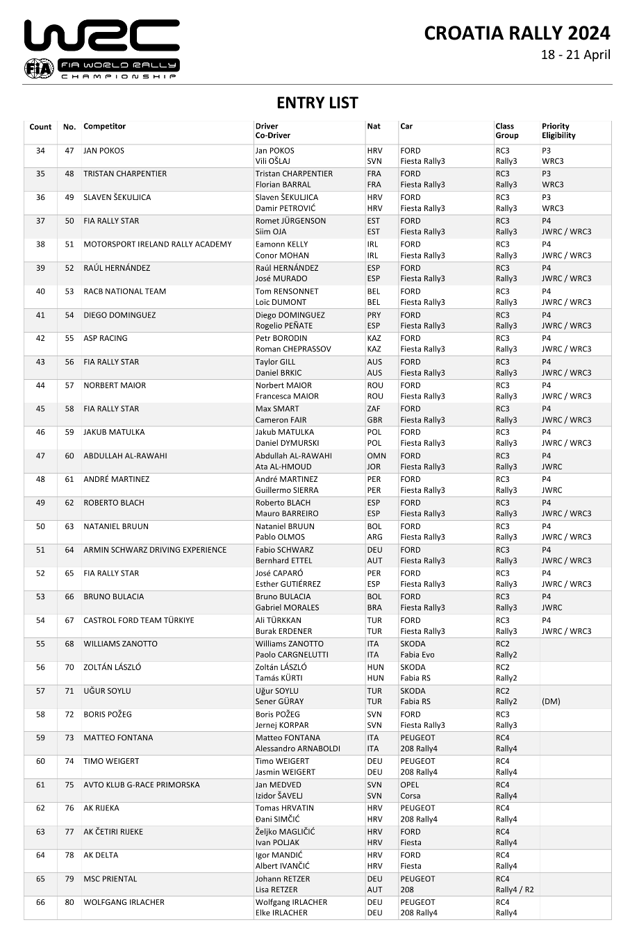 Ad aprire la strada alla categoria più numerosa del campionato ci penserà il vincitore della prima gara del campionato Yohan Rossel che per l’occasione rinnoverà la sfida avvenuta durante proprio il Rally del Monte-Carlo nei confronti di Pepe Lopez e Nikolay Gryazin conclusasi con il francese di casa Citroen vincitore di questo primo round.