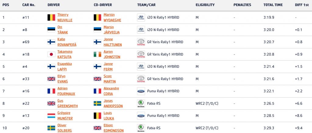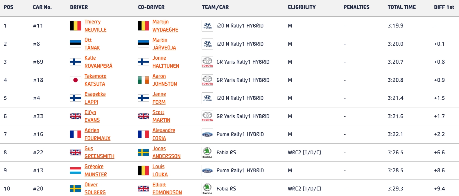 Gus Greensmith ha invece segnato il ritmo nel WRC2, conquistando l’ottavo posto assoluto su una Škoda Fabia RS, mentre Grégoire Munster e Oliver Solberg hanno completato la Top 10 assoluta.