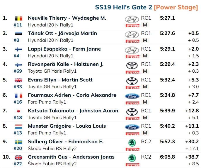 Tänak  7 punti – Neuville  6 punti – Evans  5 punti – Fourmaux  4 punti – Katsuta  3 punti – Grégoire Munster  2 punti – Lappi e Rovanperä  1 punto