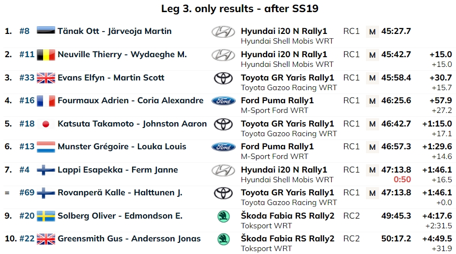 Neuville  5 punti – Tänak  4 punti – Lappi  3 punti – Rovanperä  2 punti – Evans  1 punto