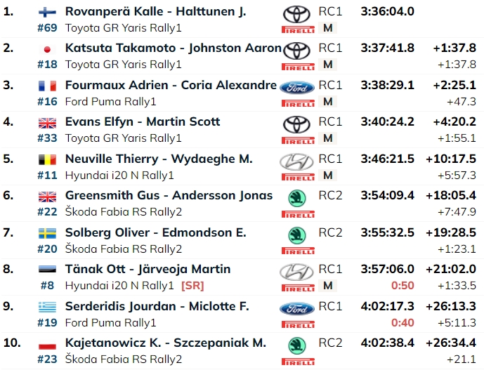 Una gara, nel complesso, dominata da Kalle Rovanperä, che ha disputato l’intera domenica in “modalità gestione”, cercando di non fare errori e stando il più lontano possibile da eventuali problemi. Questo anche grazie al grandissimo vantaggio accumulato sui più diretti inseguitori: Takamoto Katsuta, secondo al traguardo, giunge alla fine staccato di 1:37.8 mentre Adrien Fourmaux, di nuovo sul podio per la seconda gara consecutiva, è terzo staccato di 2:25.1